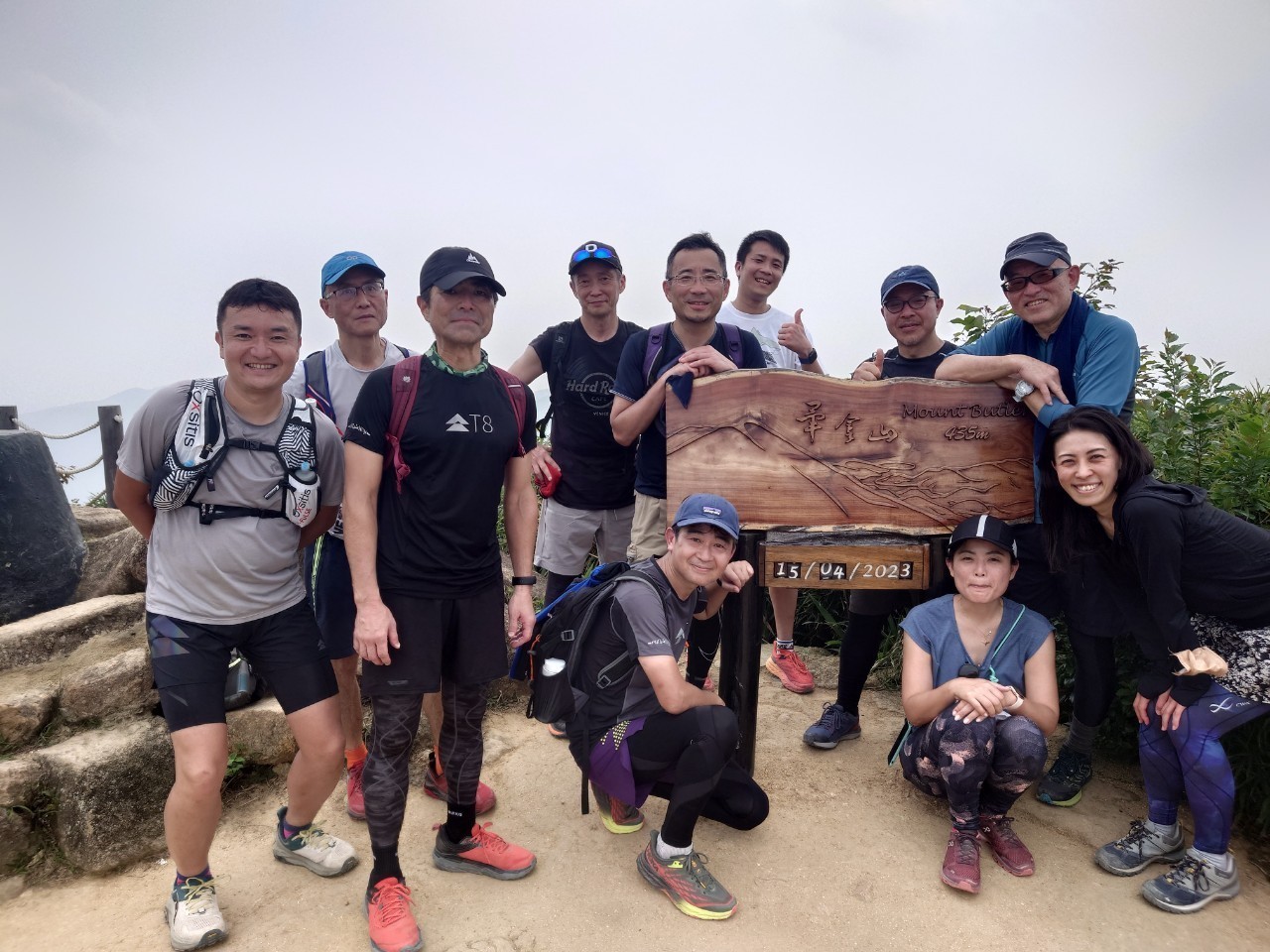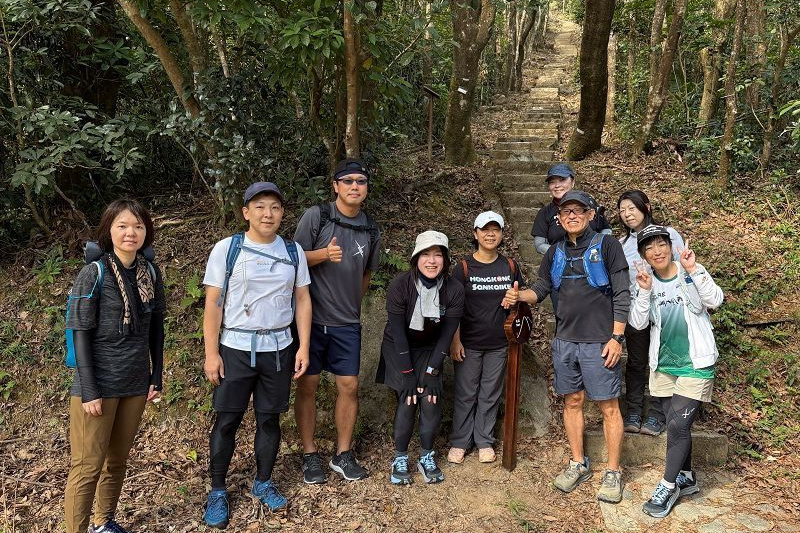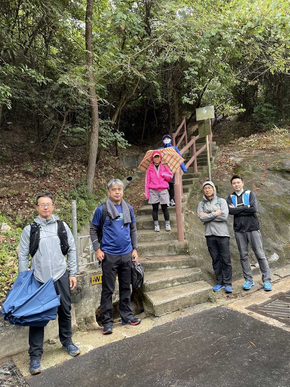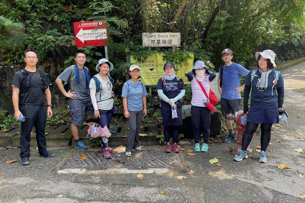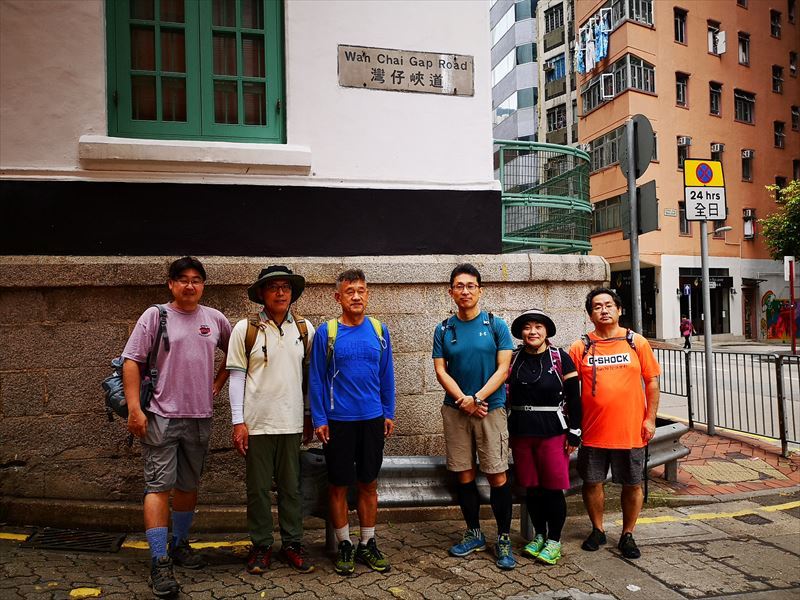 湾仔站から徒歩5分程で登山口へ。近くにお住まいの名取さん、登り口で待ち合わせ。上り口で集合写真