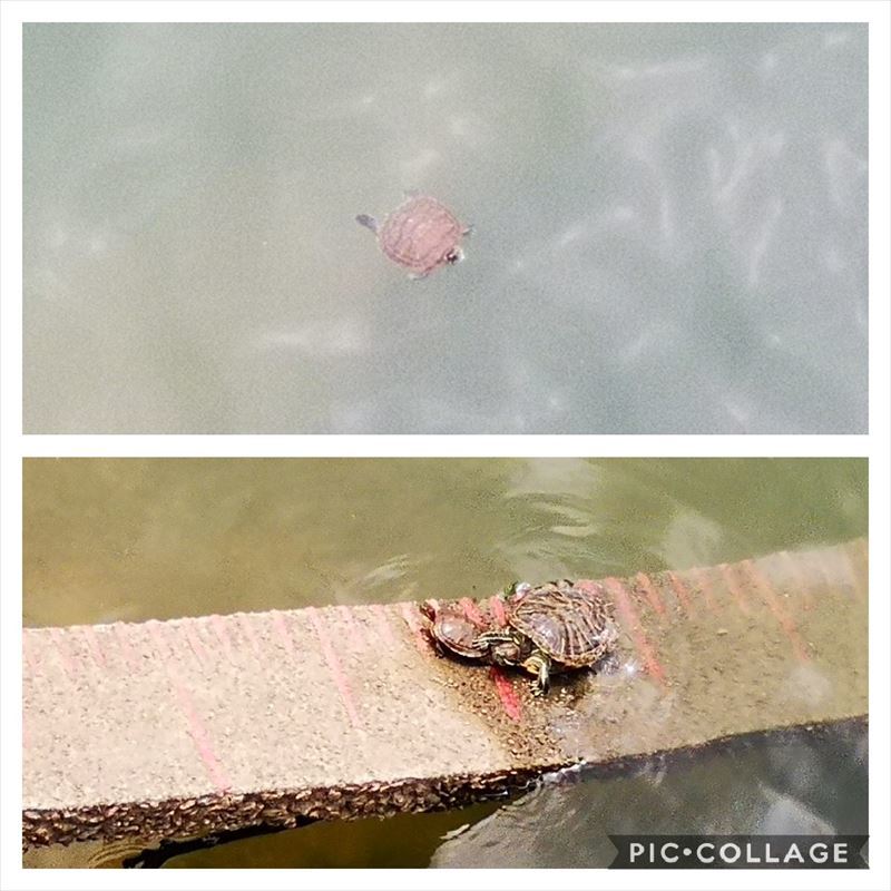 ダムより水辺を眺めていると水中に亀発見。暫し、みんなでのんびり眺める。
