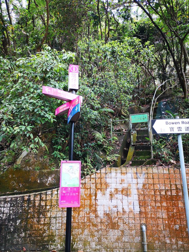 この後は安心安全の舗装路です。しばらく進むと香港トレイルのセクション3と4のジャンクションにぶつかります。セクション4の土道の方から進み、約30分でようやく灣仔峡公園へ到着。(12:30)小休憩を経て、灣仔峡道を下って灣仔の街中へ戻ります。灣仔峡道は下から登るときついだけあって、下りは相当急な坂なので膝を傷めないよう、ゆっくり進みます。13:07無事に皇后大道東沿いの灣仔峡道の入口に到着(ゴール)。藪のザレ場が登りになる逆走コースもいずれ行ってみたいと思います。