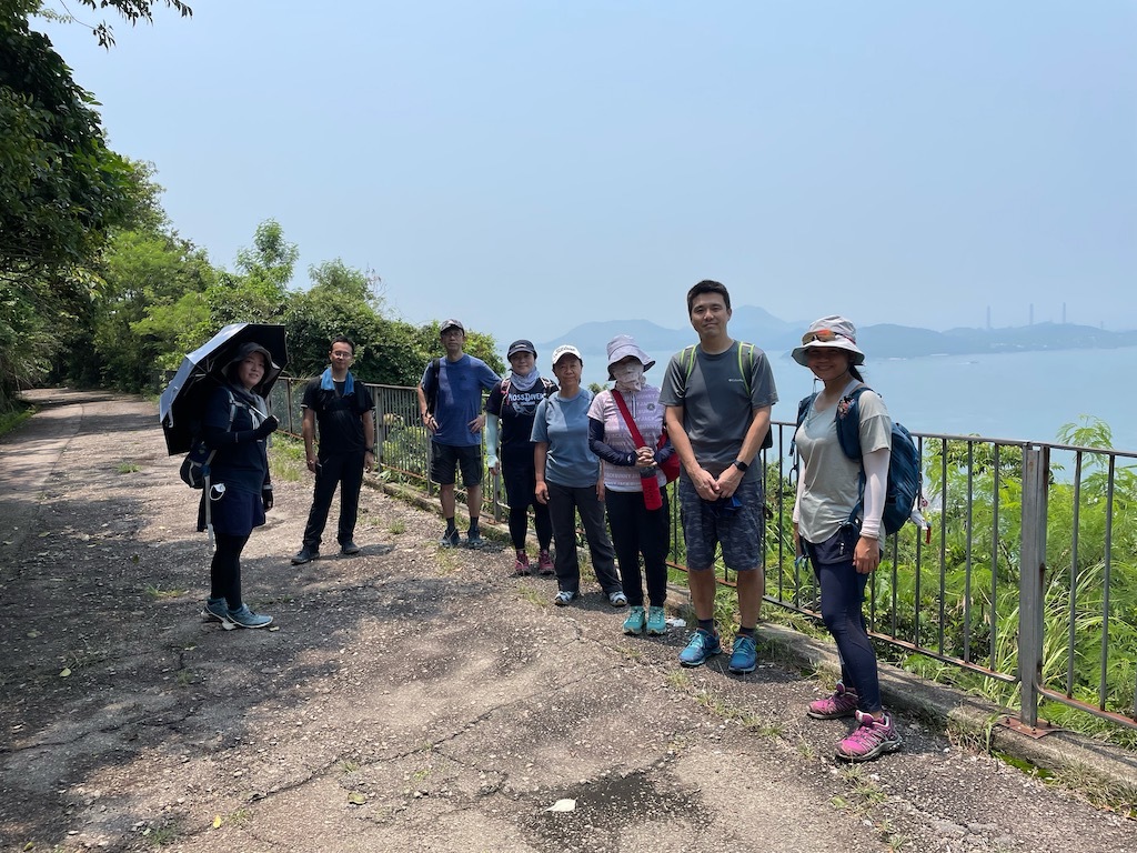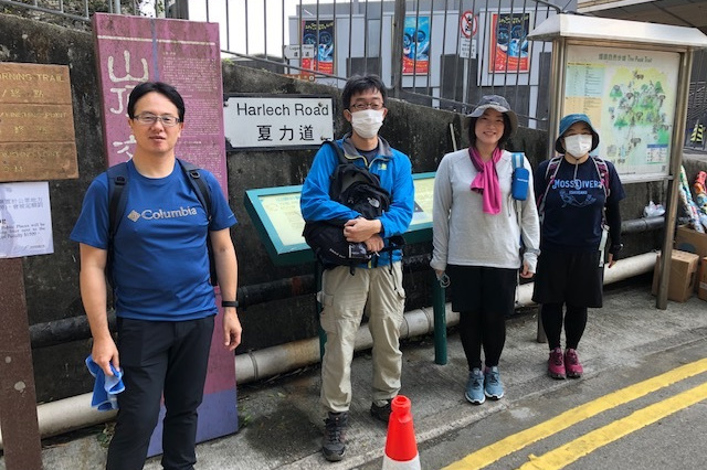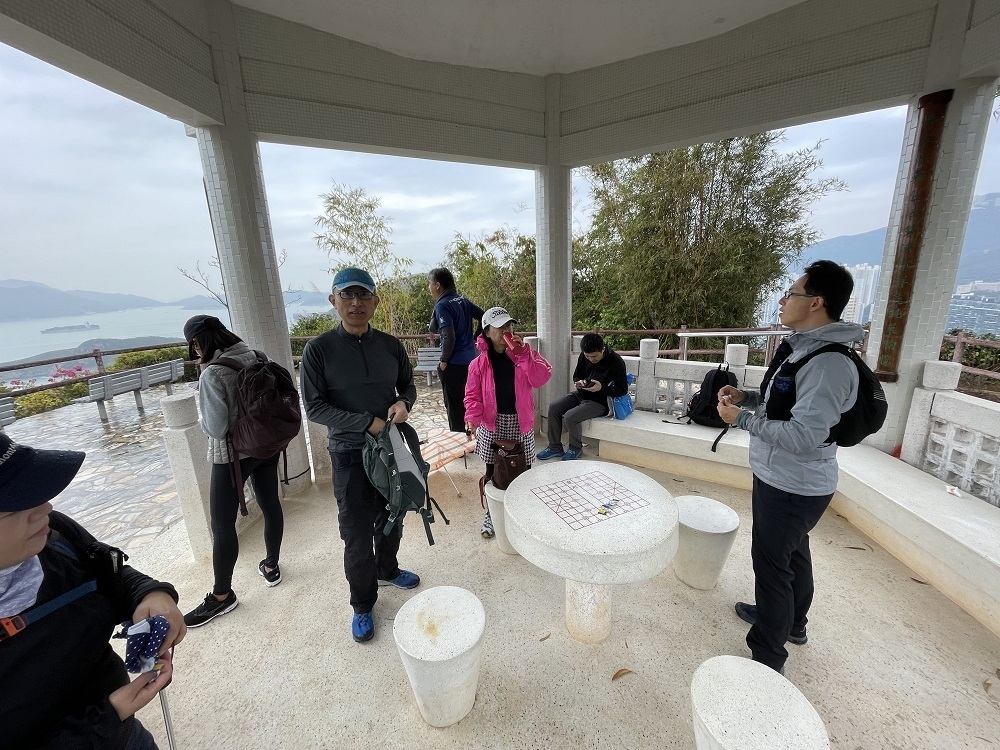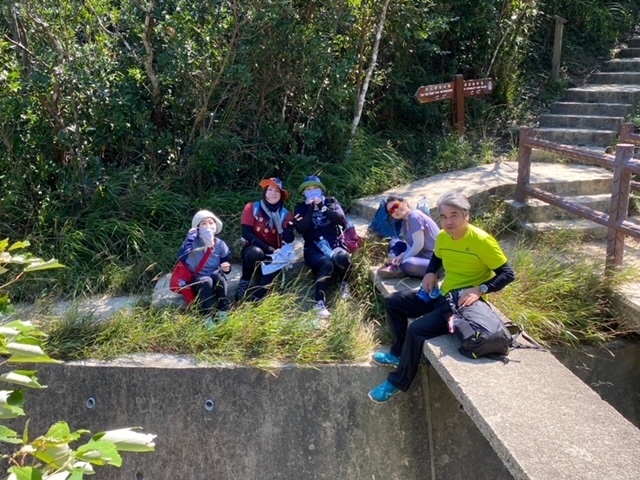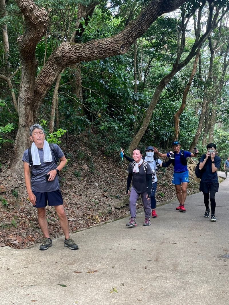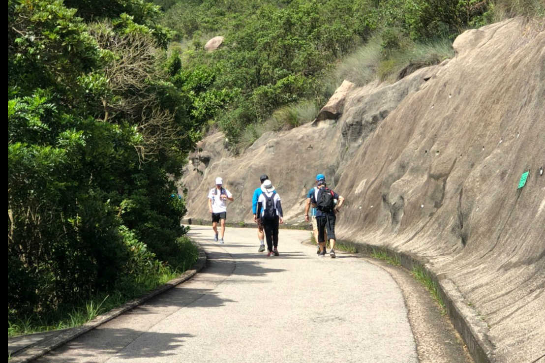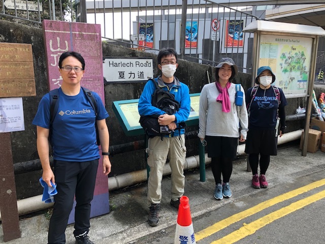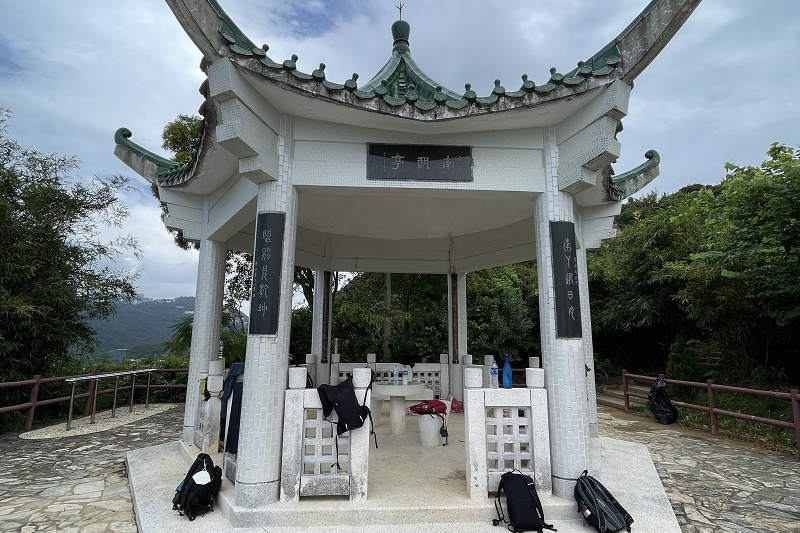 9:30鰂魚涌駅A出口に集合したのは9名。A出口を右に出てまっすぐ進むと、柏架山道自然徑の表示があるのでそこからスタート。舗装路をゆるゆると小一時間登り、ようやく現れた東屋(大風坳涼亭)で小休止。