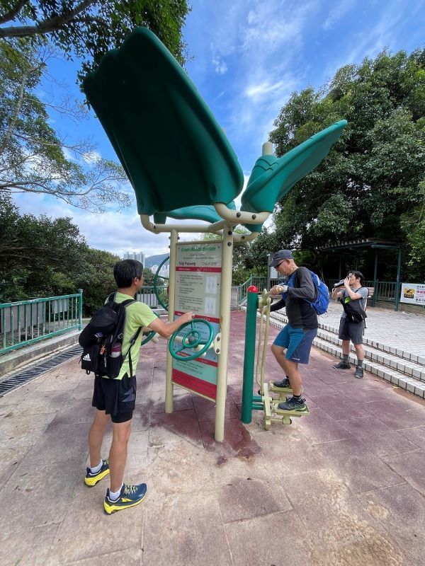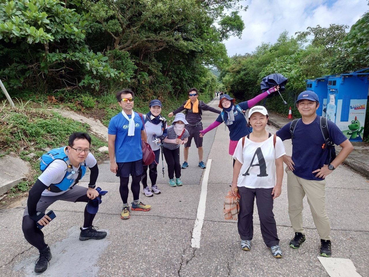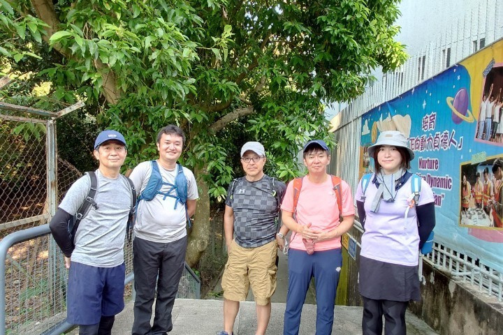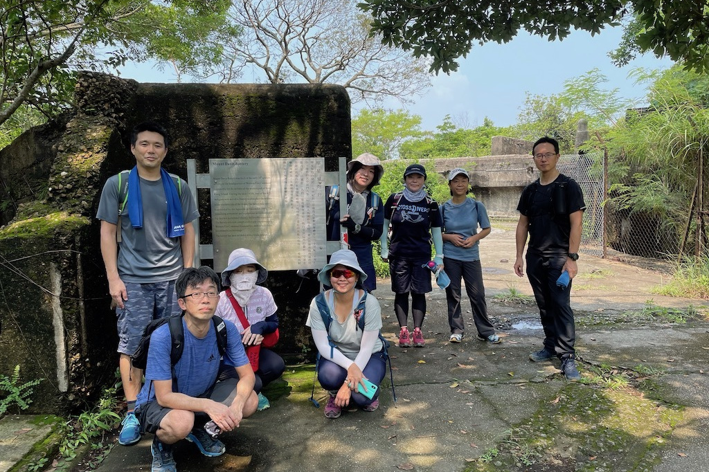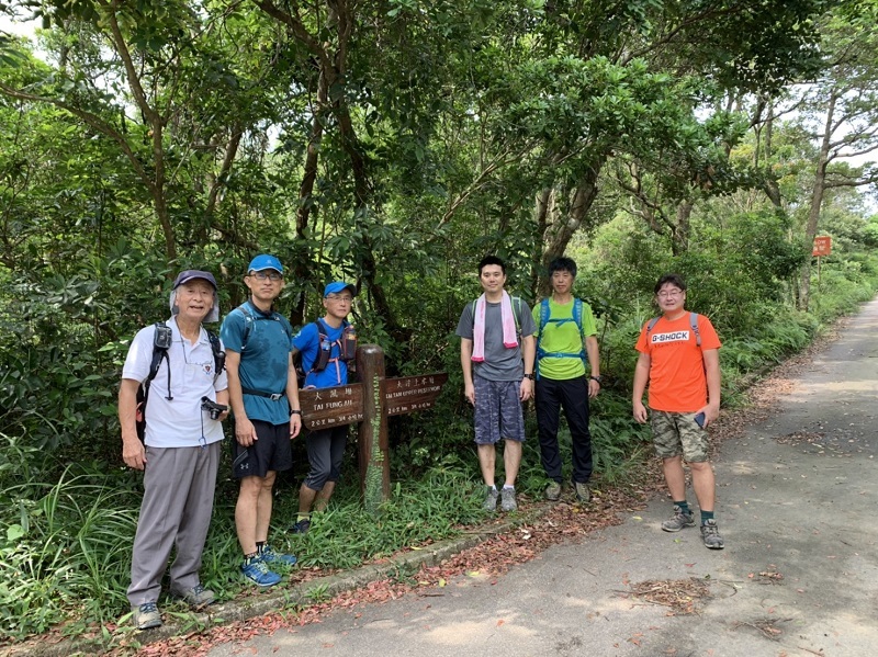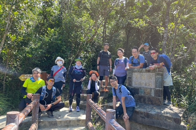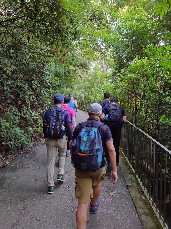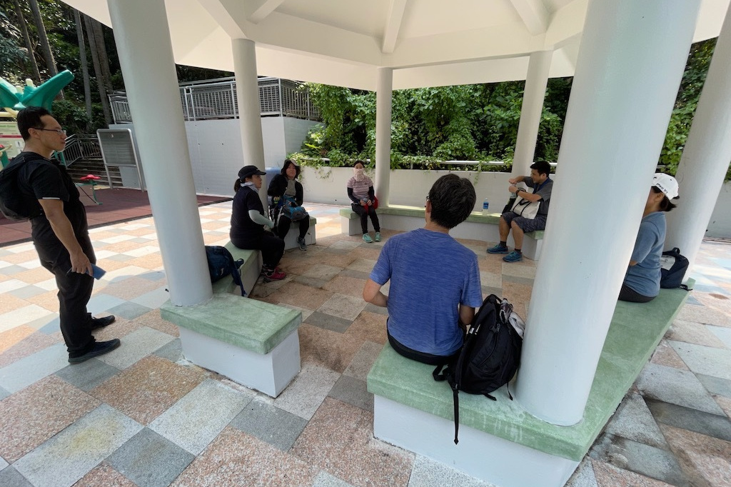 9:30鰂魚涌駅A出口に集合したのは9名。A出口を右に出てまっすぐ進むと、柏架山道自然徑の表示があるのでそこからスタート。舗装路をゆるゆると小一時間登り、ようやく現れた東屋(大風坳涼亭)で小休止。