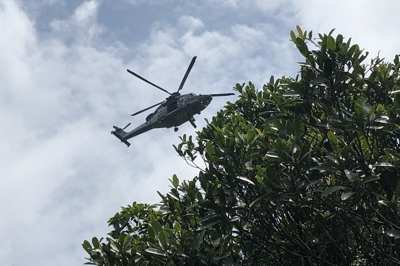 玉桂山の中腹より隊員と共にヘリコプターに乗り込み、無事病院に搬送されました。