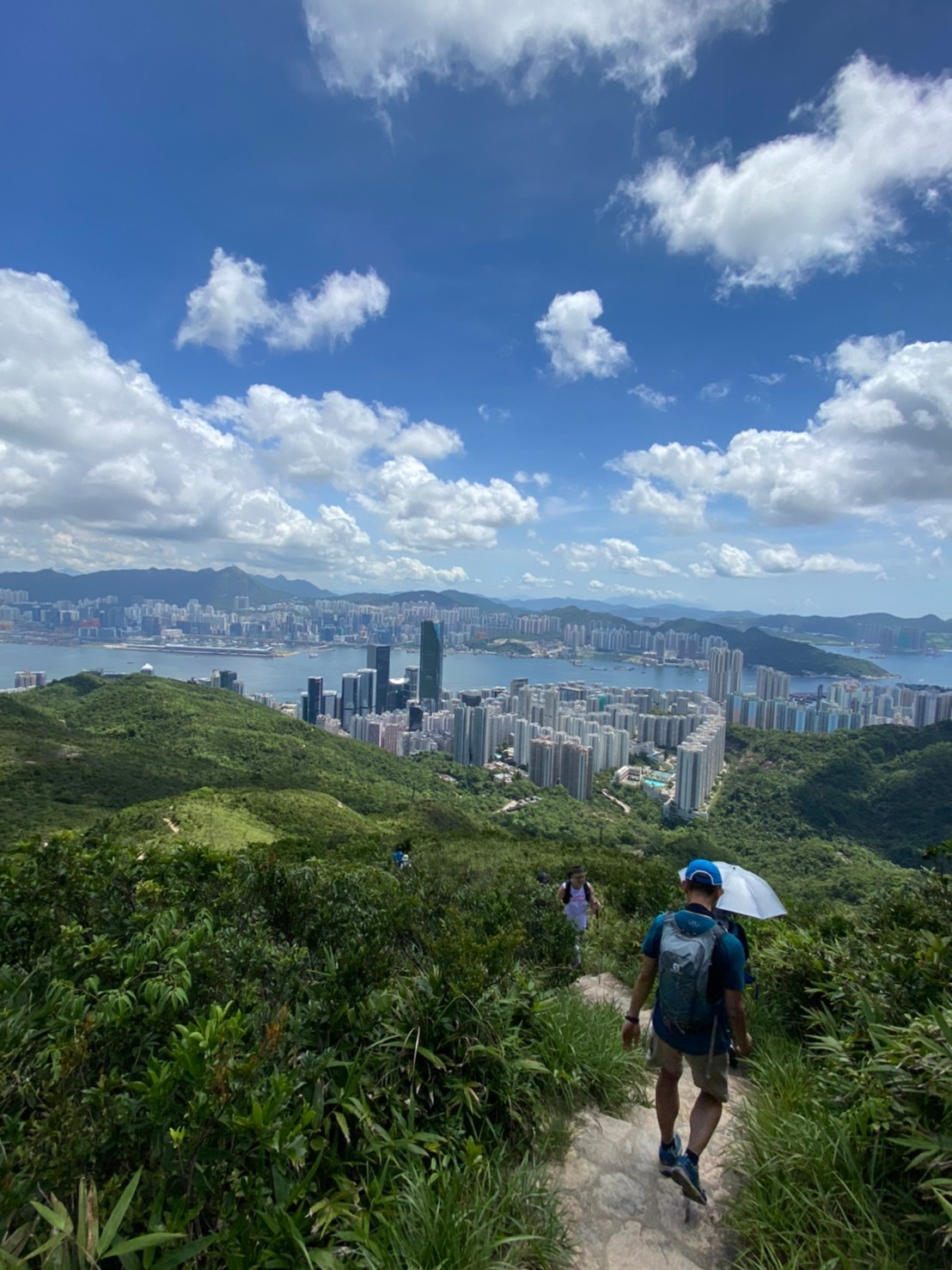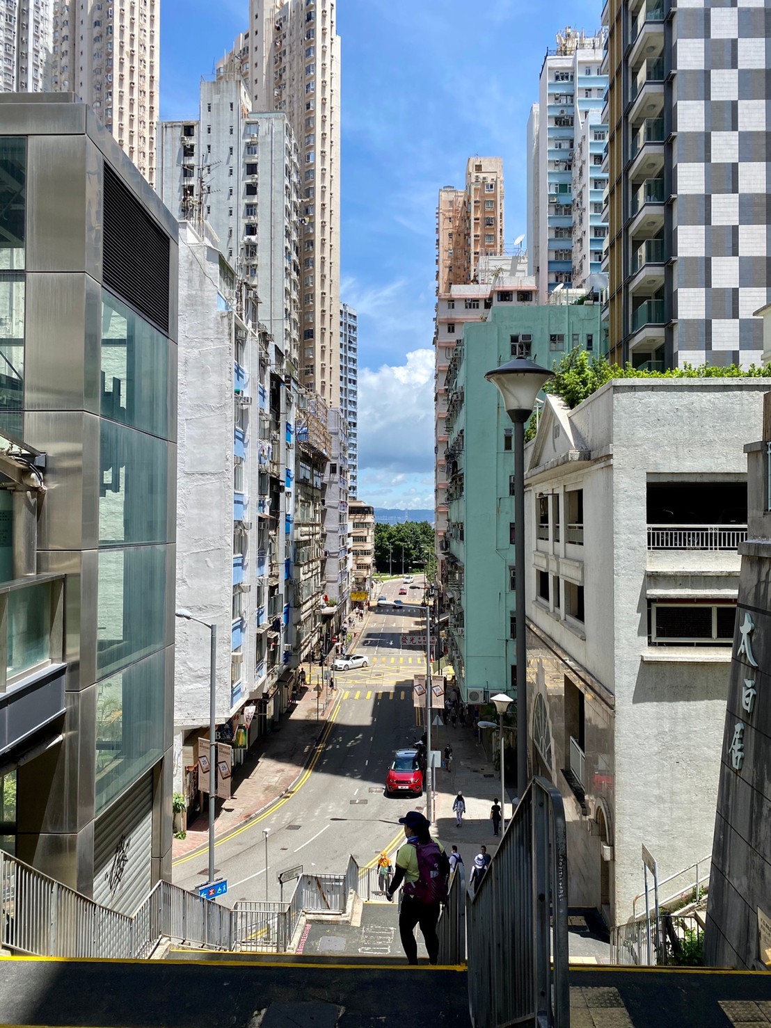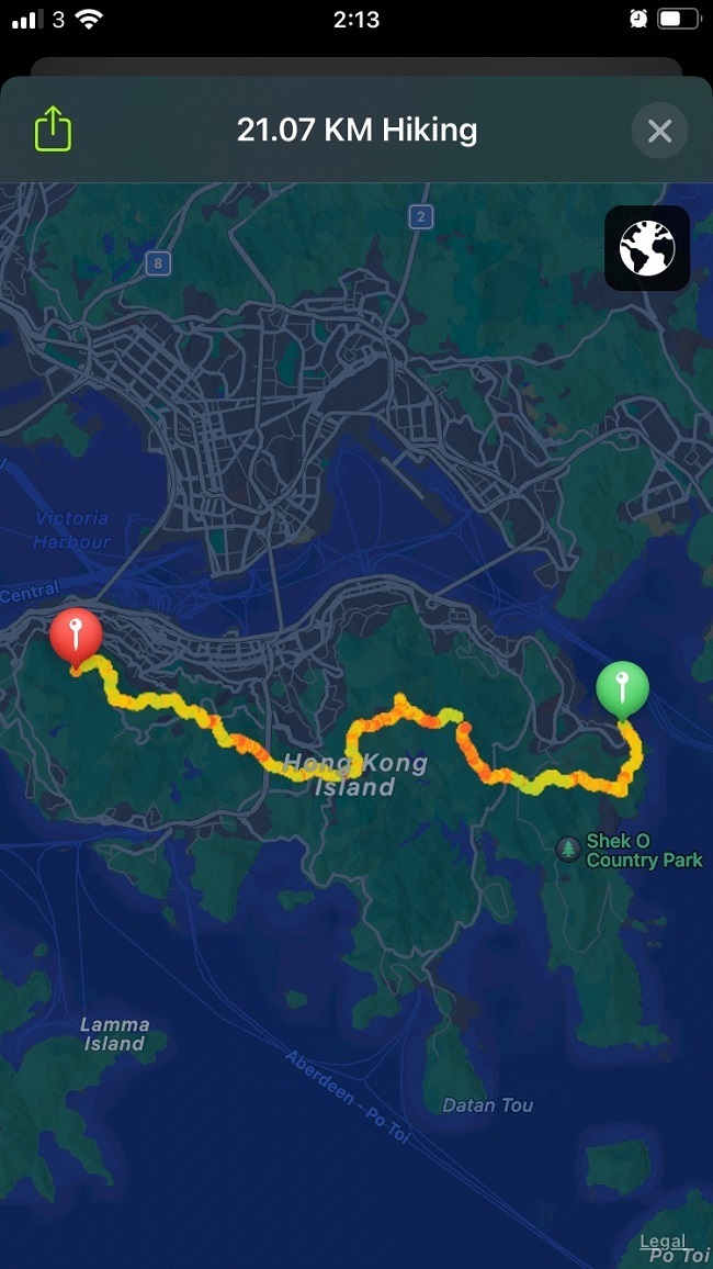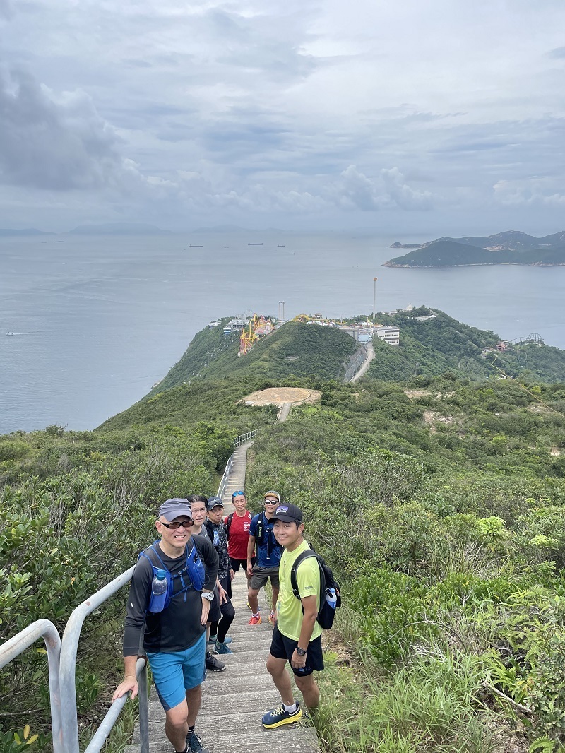 Sec.2に入り、まぁまぁ長い登り階段があります。このあと私も大好きな香港仔とアプレイチャウが見下ろせる絶景が待っています。晴れて本当によかった。香港仔とアプレイチャウの間、高層ビル群に囲まれた景色の合間に見える海がバスクリンのような色に見えます。結構急で狭い階段、カーブも多く景色に見とれていると危ないので慎重に下ります。13:20頃Sec.2を歩き終え、香港仔の打ち上げに向かいました。歩き始めを少し距離短縮したので、11.7kmで終了(13:40)。