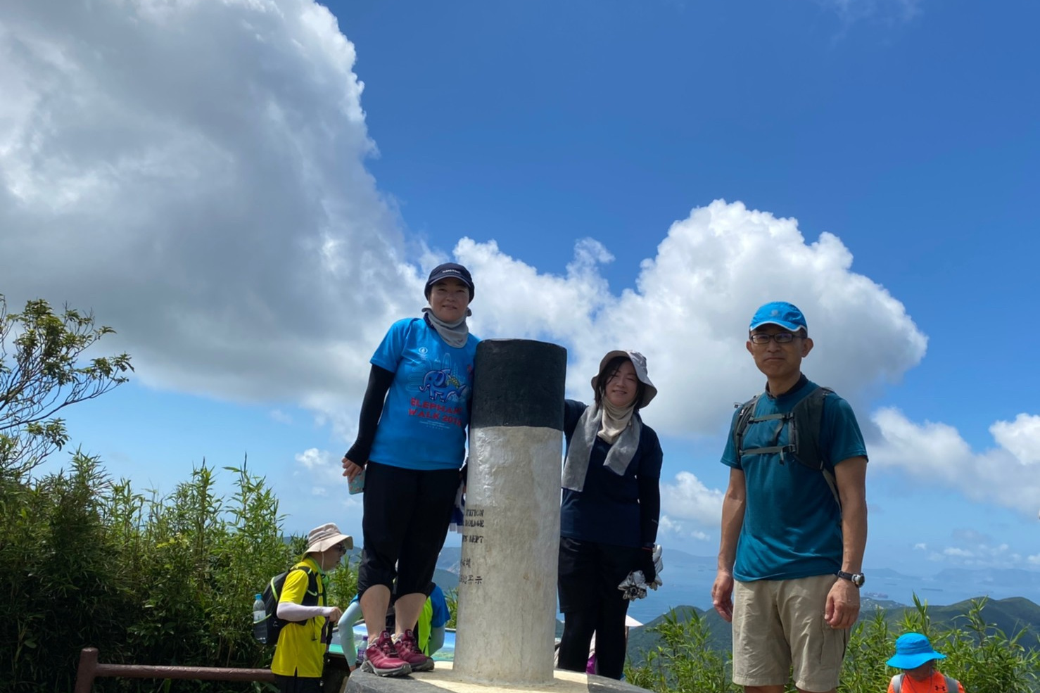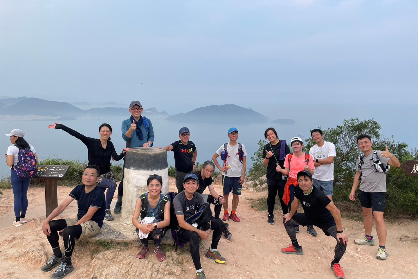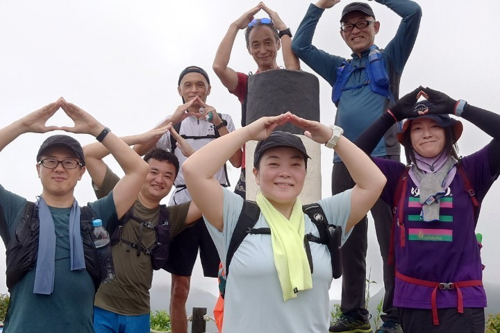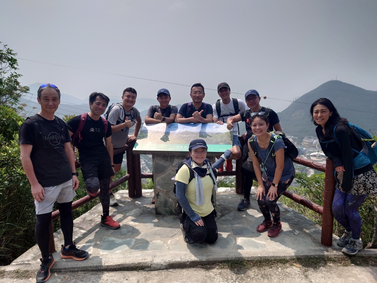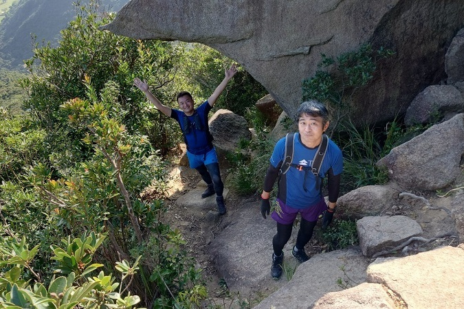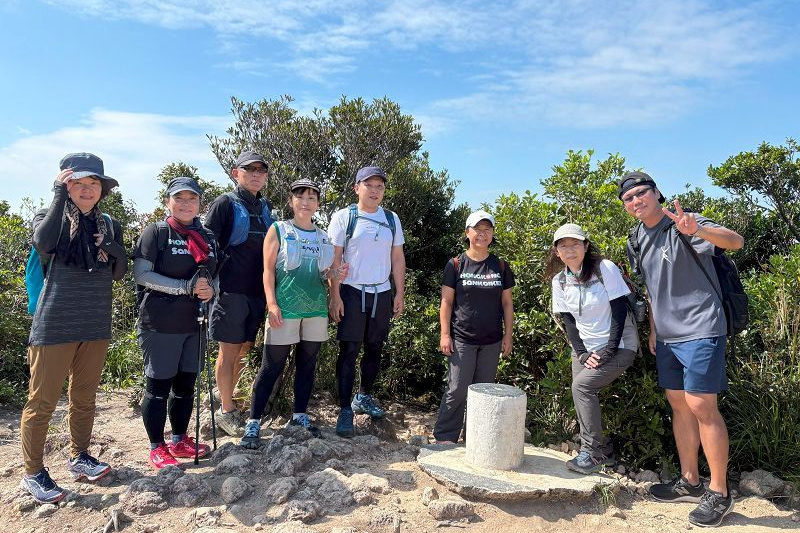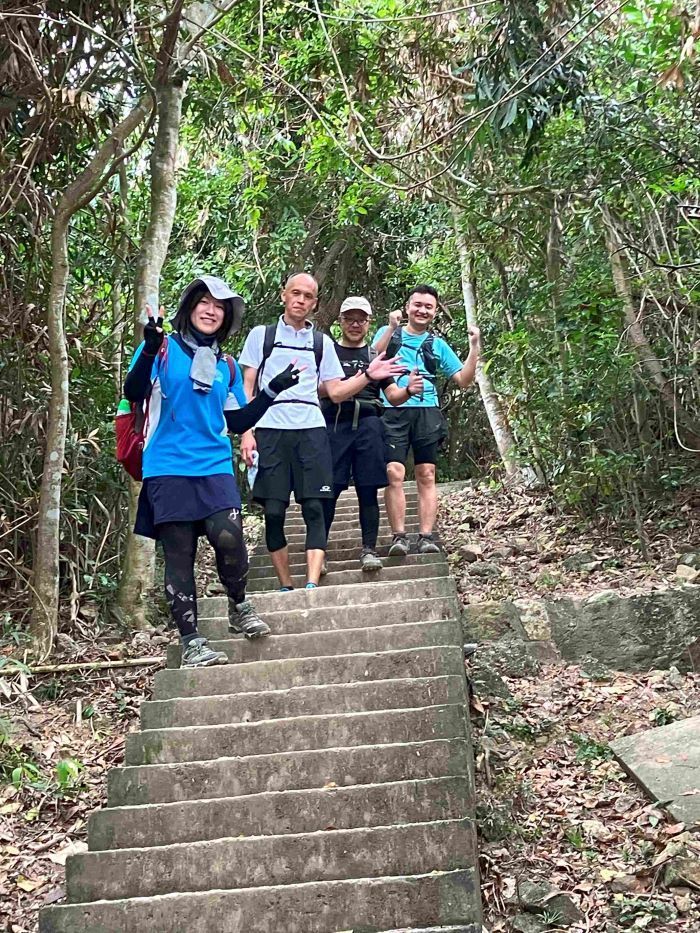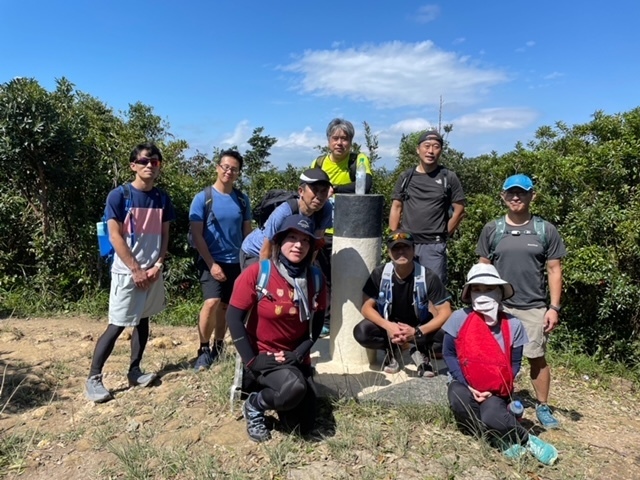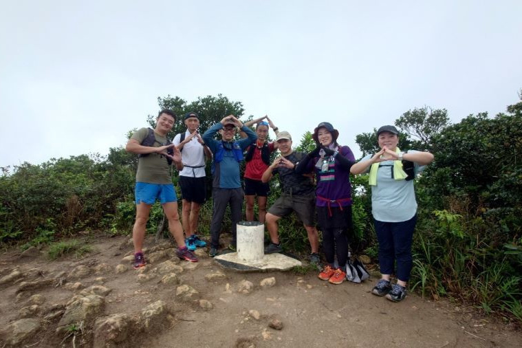東屋の先にある階段を一気に100mほど登ると、三角点のある畢拿山観景台に到達します。まずは畢拿山の三角点で記念撮影。続く小馬山のミニ三角点を通過し、稜線の絶景を楽しみながら下ります。天候に恵まれ時折風も吹いたため、気持ち良く歩く事ができました。