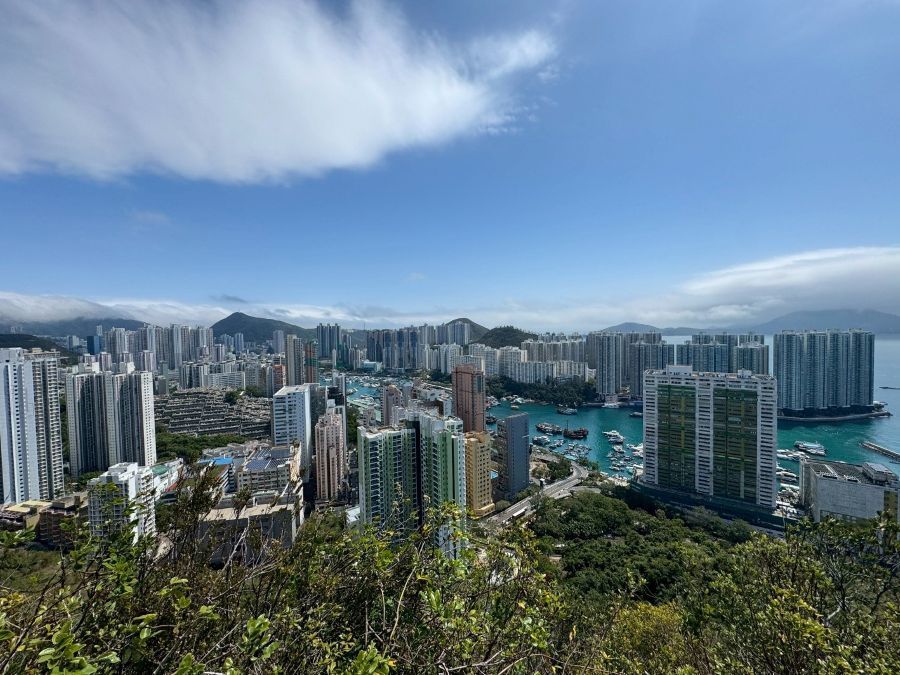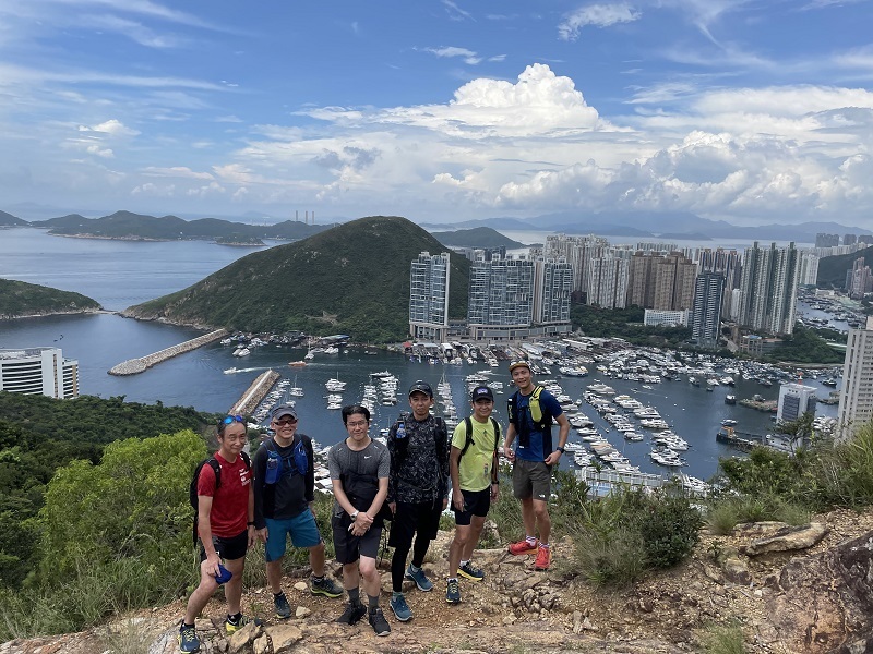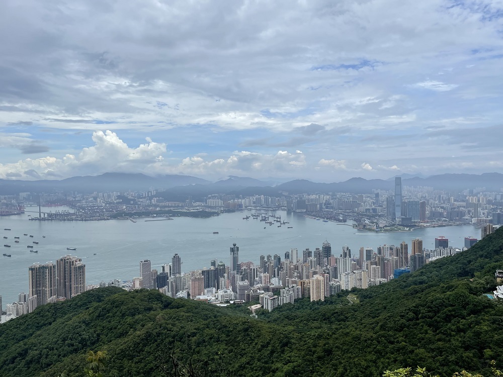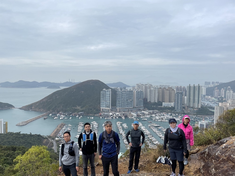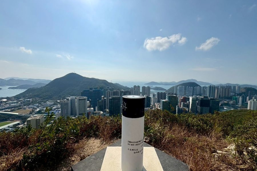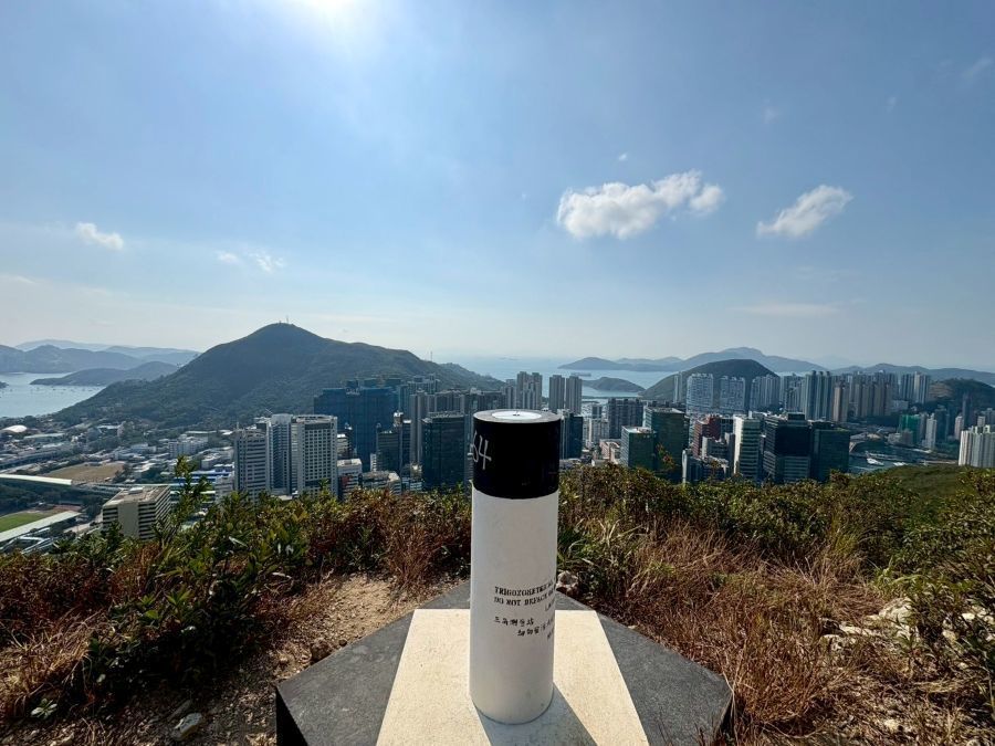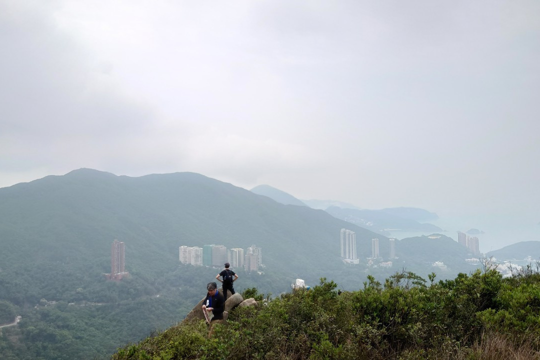 黄竹坑站B出口から続く歩道橋を数分歩きます。歩道橋を下りると、いきなり登り階段、Green Linkという爽やかな黄緑色で塗装された傾斜の激しい階段が聳え立っています。30分ほどきつい段差の階段と舗装路を歩き、中腹で小休憩。(10:40)一気に登った為、この時点で既に黄竹坑站周辺と向かいのAp Lei Chauのマンション群を見渡すことができるなかなかの景色です。階段地獄は終わりましたが、ここから藪道の始まりです。藪をかき分けながら進み、班納山(Bennet’s Hill)の三角点(214m)に11時頃到達。先ほどの中腹の景色よりさらに上からの絶景で玉桂山とその先のAp Lei Paiまで見ることができます。最初の階段がきつかったですが、スタートから約1時間という短時間でこの素晴らしい景色は結構撮れ高がいいのではないでしょうか