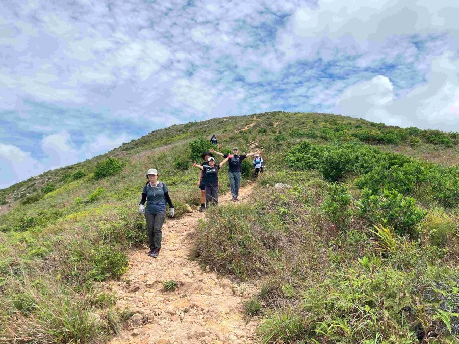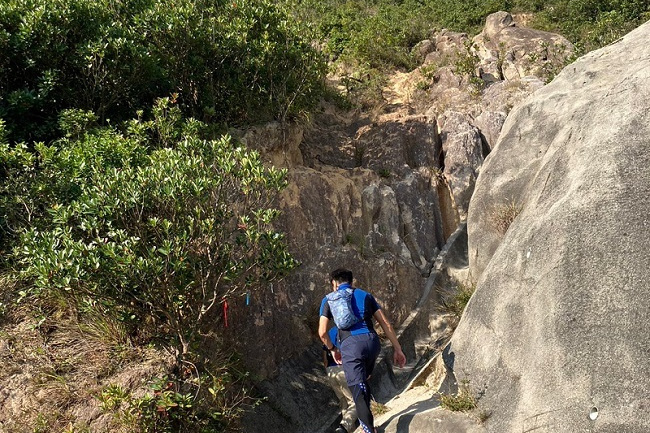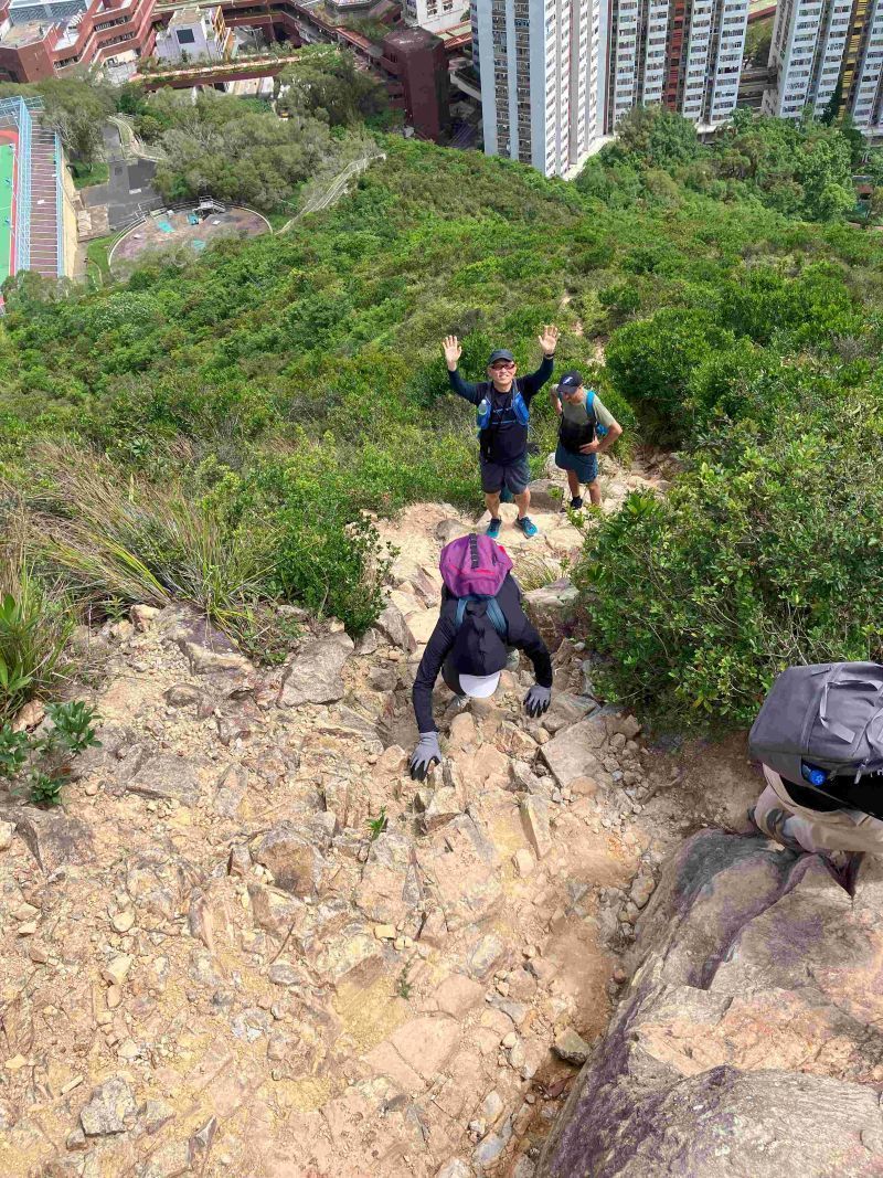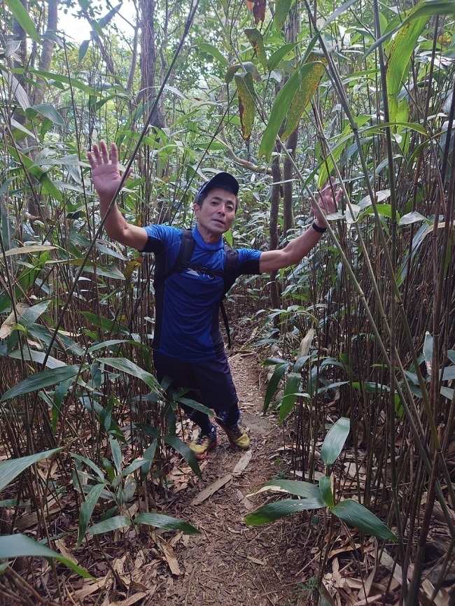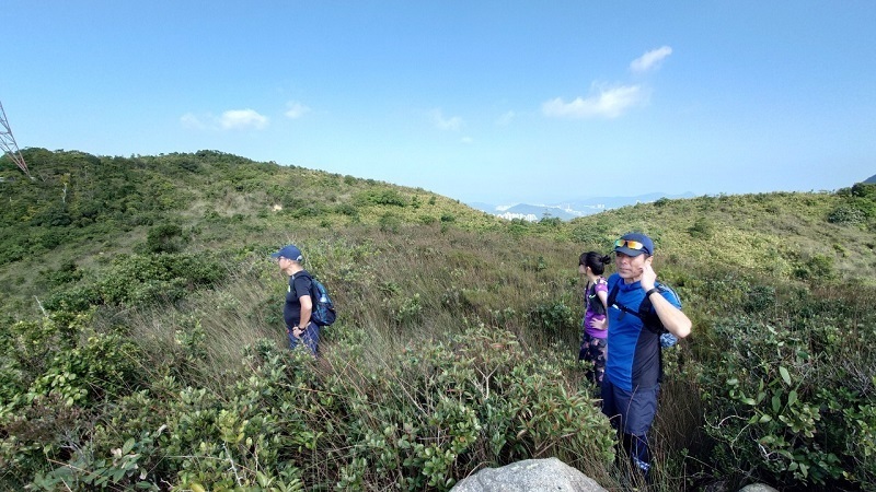 その後、西高山の登り口の少し手前まで戻り、Hong Kong Trailへ抜ける道が地図にあるのでリボンの目印を頼りに下る。少々道が狭く、木が邪魔して歩きにくく、今日も難易度詐称疑惑のお声も聞きながら30分ほど下り、Hong Kong Trailに辿り着いた。