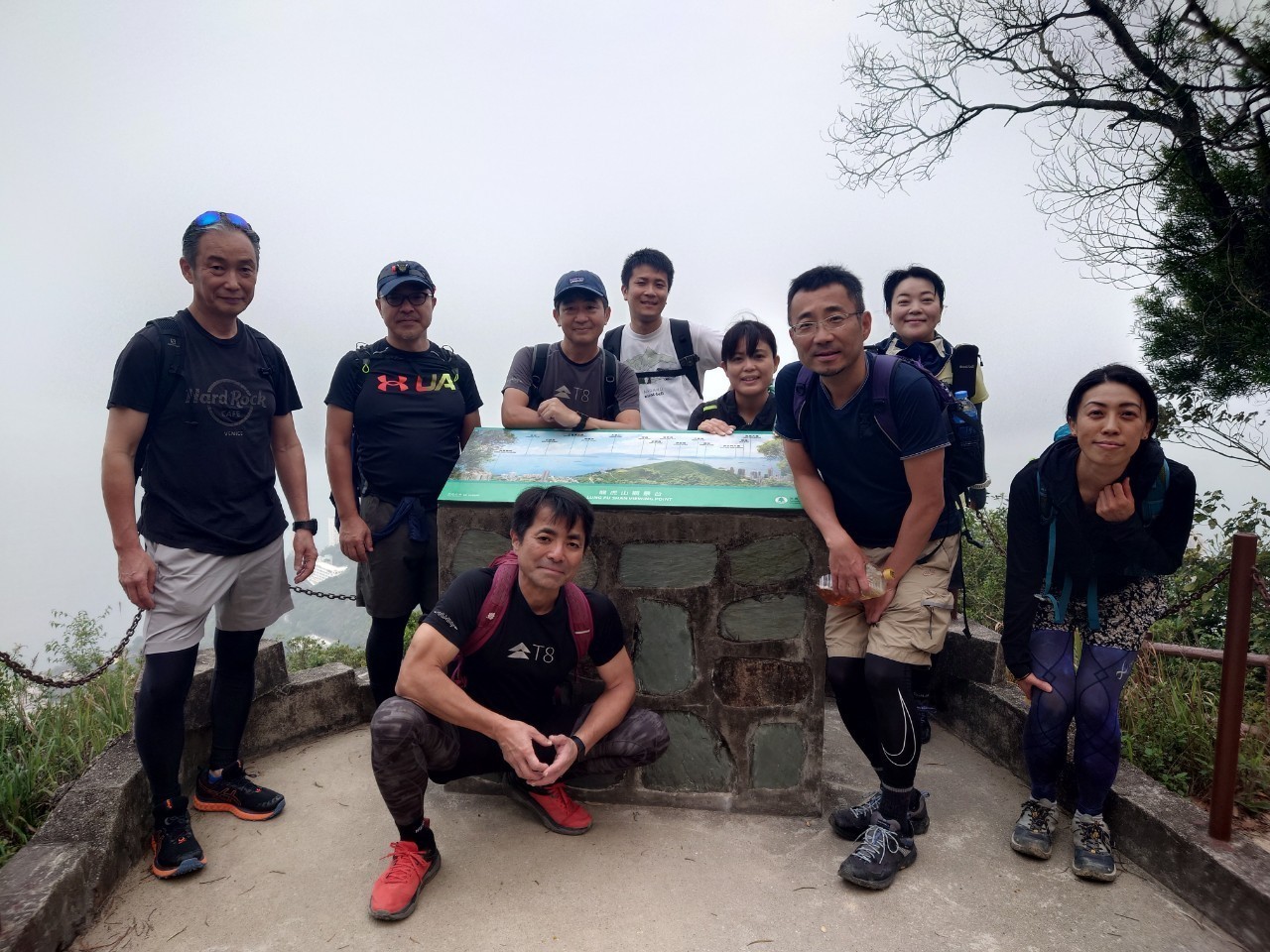 前日からの雨は朝には止み、9:45金鐘站にお久しぶりのジェームズさんを含む5名が集合し山頂行き15番バスに乗車しました。山頂に着く少し前、下から歩いて登る健脚・森田さんから、西高山登り口の公園に到着したとの連絡が入りました。バスを下車すると雨は止んでいるものの、霧で真っ白。景色が何も見えないので、いつものビクトリアハーバー沿いではなく、逆から歩き始めました(10:30)。